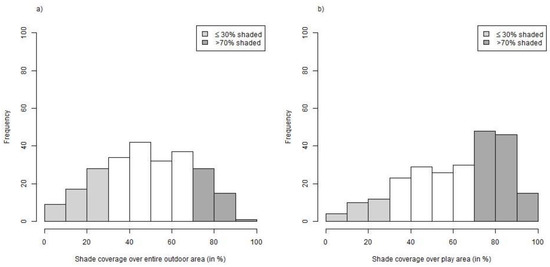 Histograms of shade coverage observed in 243 nurseries in Bavaria, southern Germany: (a) shade coverage over entire outdoor area; (b) shade coverage over play area.