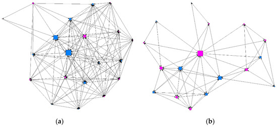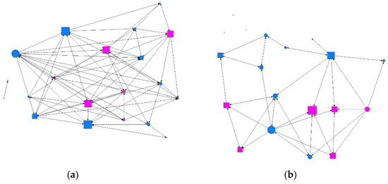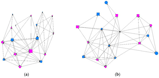Graph of minimum contact intensity in a class. Males are shown in blue and females in pink; circles represent individuals whose consumption did not present a risk and squares represent individuals showing at-risk use. Graphs produced using UCINET software [48]: (a) where the size of the nodes indicates the degree of intermediation (betweenness); (b) where the size of the nodes indicates the degree of ties (degree).