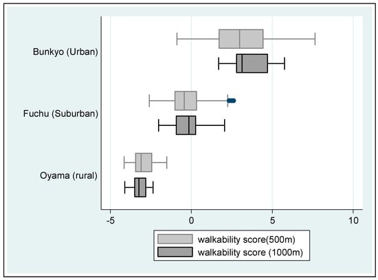 Distribution of individual walkability score by city of residence Note: Box-whisker plot indicates median line, quartile box, whiskers for the most extreme cases inside 1.5× interquartile range (IQR), and outliers.