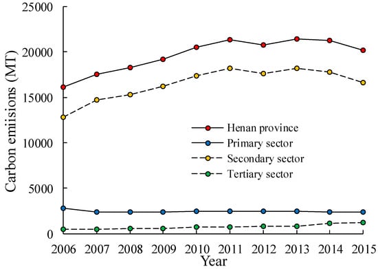 Variation of carbon emissions over time from three major economic sectors in Henan Province during 2006–2015.