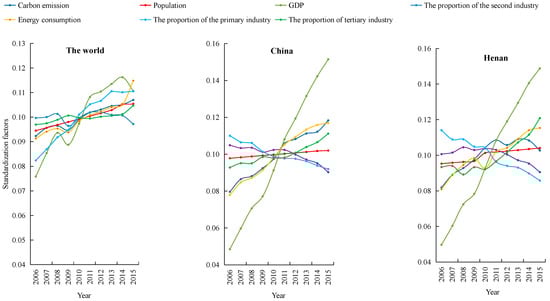 Figure 3 shows the changes in Henan Province carbon emission and its influencing factors. In 2015, China accounted for 28.48% of the world’s total carbon emissions, Henan’s carbon emissions account for 1.96% of China’s total carbon emissions. Compared with 2015, the growth rate of carbon emissions in China and Henan Province was 1.28 times and 1.08 times higher than the world average in 2006; the proportion of the tertiary economic sector in the world, China and Henan Province was 70.12%, 50.19% and 40.20% respectively, however, the proportion of the secondary economic sector in China and Henan Province was 13.85% and 21.34% higher than that of the world’s second economic sector, this indicated that the difference of industrial structure had an important impact on the growth of regional carbon emissions. The implementation of the strategy of “Central Plains Economic Region” in 2012 had made significant changes in the industrial structure of Henan province, 2012–2015, the proportion of the primary and secondary economic sector decreased by 1.10% and 5.29% respectively. The rate of decline was significantly higher than that of 2006–2011 and the change in carbon emissions was consistent with the primary and secondary economic sector.