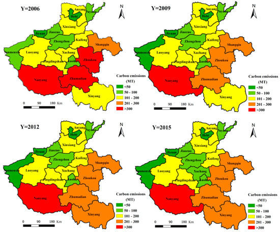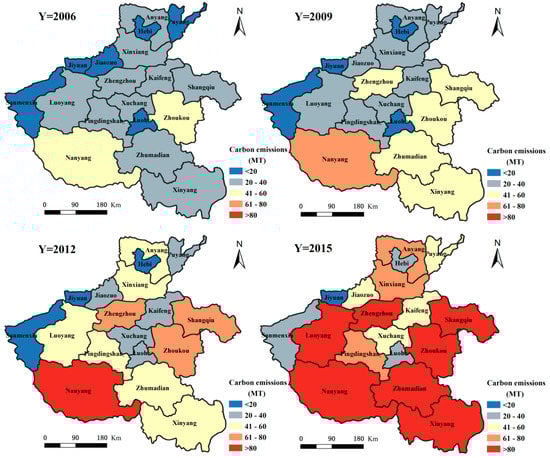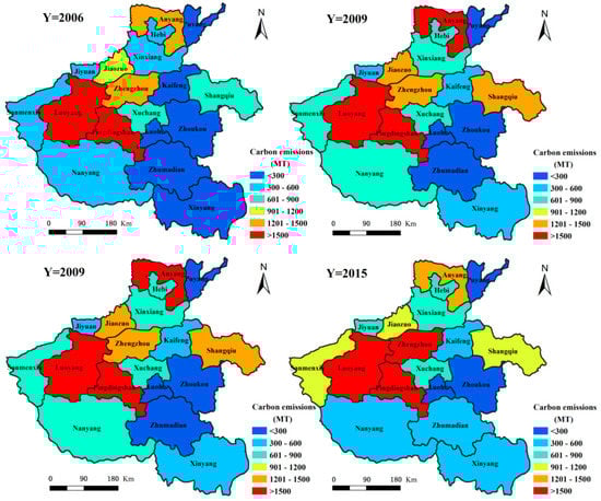 Spatial differences in carbon emissions from the secondary sector in Henan Province during 2006–2015.