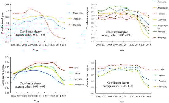 The main reason is that it has seen a rapid economic growth in the Central Plains Economic Zone. The per capita GDP has seen an increase from 34,069 yuan/person in 2006, to 72,992 yuan/person in 2015. Simultaneously, the total carbon emissions in Zhengzhou City have increased from 14.18 million tons in 2006 to 20.10 million tons in 2015. It can be concluded that as the per capita GDP doubled, the carbon emissions grew by half. This rapid economic development is however at the cost of the environment. The decline rate of the coordination degree in Zhoukou City is the most rapid. The coordination degree of development decreased by 22.99% from 0.87 in 2006 to 0.67 in 2015. In the process of industrial economic development in Zhoukou, the industrial carbon emission structure changes too fast and the carbon emission structure does not match the industrial economic structure. The carbon emission growth structure changes from the primary industry to the tertiary industry. In 2010–2015, the industrial GDP growth rate of Zhoukou City increases by 81% compared with 2006–2009. The change in carbon emission structure increases the gap between industries. A marked decline in the coordination degree of the economic development between the various prefecture-level cities in Henan province is seen. Here, not only are the coordination degrees of development quite different but the differences in the differences in variability are also large.