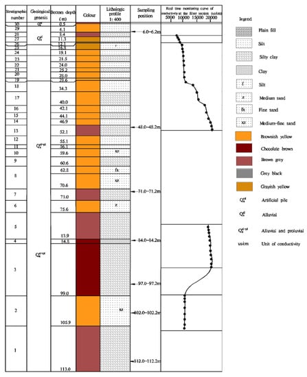 According to the real-time monitoring of groundwater quality from 31 December 2016 to 4 March 2017, the groundwater water quality in each hydrological observation borehole was relatively stable. The average conductivity in the four boreholes, at groundwater depths of 8.0–12.0 m, 13.0–49.2 m, 79.0–90.0 m and 98.0–107.9 m, was 8801.82 μS/cm, 14,603.57 μS/cm, 18,734.42 μS/cm and 11,314.42 μS/cm, respectively. The correlation coefficient of the retardation coefficient of clay for Na