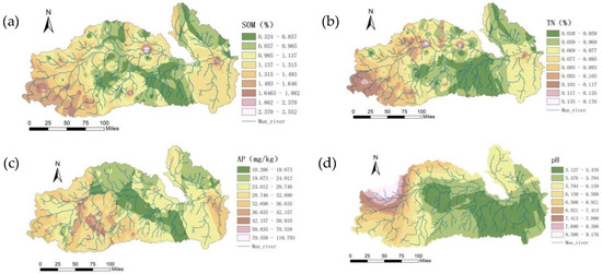 The spatial pattern of soil pH has obvious consistency with the land use pattern. The forestland had a low pH and exhibited strong soil acidity: the organic acids and enzymes released to the soil from the plant litters and roots, the shed root cap cells, and the residual roots not only increase the SOM content but also contribute to the activity of the microbes, facilitating the dissolution of plant nutrients and increasing the soil fertility; organic acids also neutralize OH- ions in the soil, thereby reducing soil pH. Although soil pH value does not directly indicate the content of a certain nutrient in the soil, its level can control and influence the change of microflora in the soil, thus affecting most elements’ conversion direction and process as well as their states and their availability.