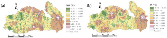 SOM generally showed a decreasing trend. The SOM contents in most areas of the upper and middle reaches in the rainy season were lower than those in the dry season; most of these areas were paddy field. The SOM contents in the edge area of the middle reaches and in some areas in the lower reaches in the rainy season were higher than those in the dry season; most of these areas were forest and non-irrigated farmland.
