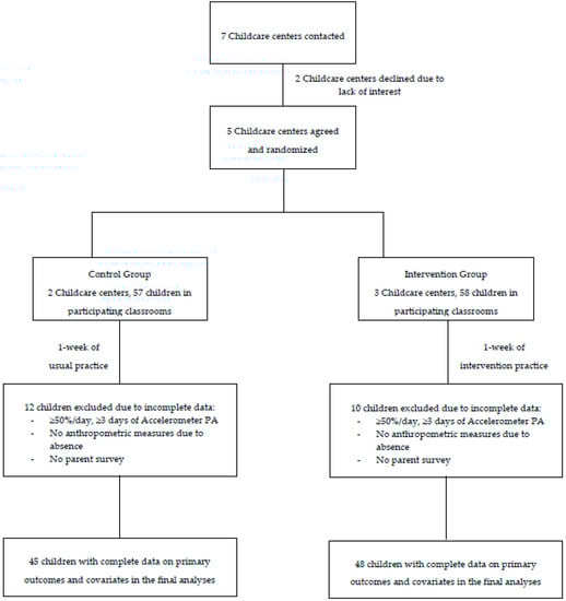 - Adamo, K.B.; Wasenius, N.S.; Grattan, K.P.; Harvey, A.L.J.; Naylor, P.J.; Barrowman, N.J.; Goldfield, G.S. Effects of a Preschool Intervention on Physical Activity and Body Composition. J. Pediatr. 2017, 188, 42–49. [Google Scholar] [CrossRef] [PubMed]