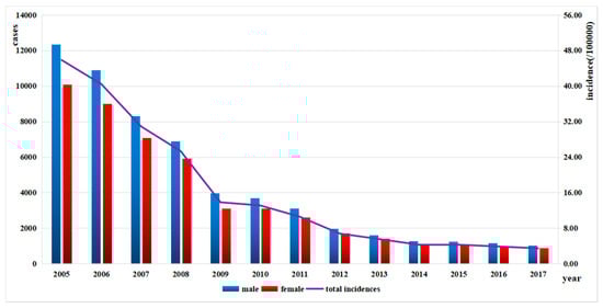 Total incidences and gender distribution of bacillary dysentery in Zhejiang Province from 2005 to 2017.