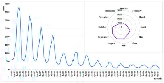Monthly distribution of bacillary dysentery in Zhejiang Province from 2005 to 2017.