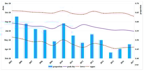 Peak days of bacillary dysentery and proportion from July to October in Zhejiang Province in 2005–2017.