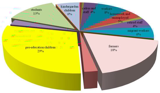 Gender distribution showed that the number of cases in males was higher than in females every year (Figure 2). The incidences in all age groups declined from 2005, and the incidences and the number of cases in 0–5-year group were much larger than other age groups. The Spearman’s rank correlation showed that the incidences in every age group were negatively correlated to year (p < 0.001), while the incidences were negatively correlated to age groups only during 2005–2008 (p = 0.022, 0.025, 0.044 and 0.047, respectively) (Table 1). In terms of occupation, the proportions of pre-education children, farmers and students were consistently higher than others every year, and the differences between occupations were statistically significant (p < 0.001) (Figure 5).