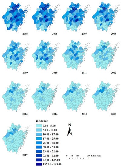Incidence maps of bacillary dysentery in Zhejiang Province from 2005 to 2017.