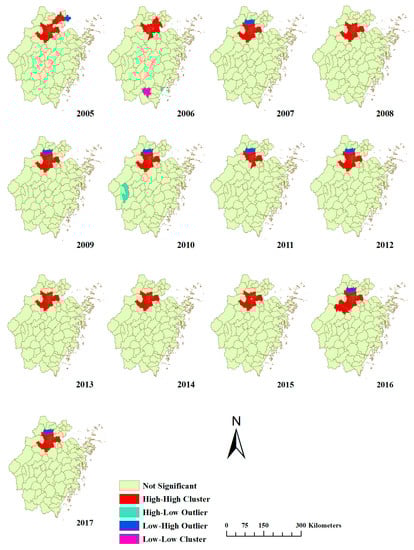 All the values of Moran’s I for global autocorrelation were positive (0.522, 0.520, 0.638, 0.721, 0.556, 0.510, 0.693, 0.690, 0.677, 0.704, 0.723, 0.690 and 0.739, from 2005 to 2017, respectively) (p < 0.001 each year), suggesting a clustering distribution at the provincial level every year (Table 2). Local autocorrelation detected 128 high–high, 10 low–high, 2 high–low and 1 low–low clusters (Figure 7). High–high clusters were observed in Hangzhou every year from 2005 to 2017.