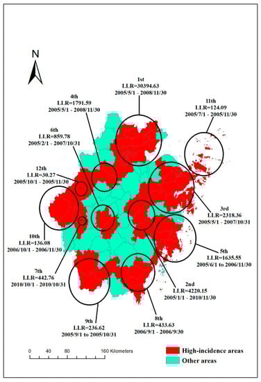 Spatiotemporal scan reflected clustering. In this study, clusters occurred almost every year from 2005 to 2008. A project aimed at reconstructing the water supply and lavatories was launched in Zhejiang Province in the 1980s, which was further strengthened in 2008 []. Given that sanitary interventions effectively reduce the intestinal infectious diseases, the project might have resulted in a sharp decline of bacillary dysentery after 2008. Social and economic development might account for the observation that all high-incidence clusters of bacillary dysentery occurred before 2011.