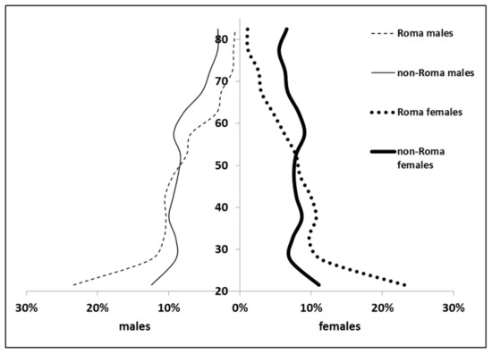 Distribution of age groups in the studied Roma and non-Roma populations.