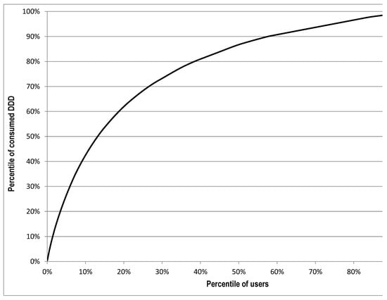 The annual amount of DDDs was used to categorise the NSAID consumption. We set the limit for low use to 30 DDDs and chronic use to more than 90 DDDs. Lorenz curves were used to identify heavy consumers of NSAIDs within the cohort. This analytical tool was applied to NSAID use to highlight the unequal distribution of drug consumption within the study population [,]. In the Lorenz curve, the x-axis represents the accumulated percentage of drug users and the y-axis the accumulated percentage of total consumption (DDD) per year. Thus, it shows the proportion of drug use accounted for by percentiles of drugs users, ranked according to their volume of consumption, measured in DDD. We defined heavy users of NSAIDs as those above the 95th percentile of consumption (i.e., the 5% of patients with the highest DDD values). Within this group, distribution by age and prescribing patterns per pharmacological subgroup were compared with those observed for the remainder of NSAID consumers (non-heavy users). The two groups were compared using a χ2 test, with statistical significance set at p < 0.05.