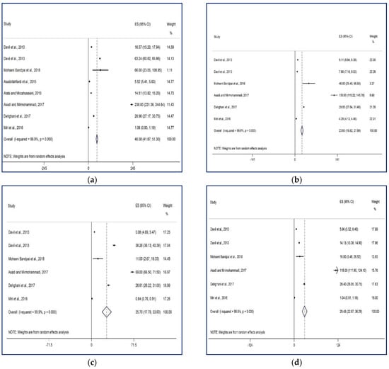 Forest plot of concentration (ppb) of benzene (a), toluene (b), ethylbenzene (c), and o-xylene (d) in the ambient air of Tehran. ES: effect size, CI: Confidence interval.