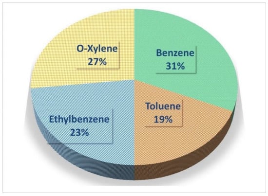 Among VOCs, benzene, as a hazardous compound with a relatively long lifetime, belongs to group 1; carcinogenic to humans [17,18]. Whilst the mutagenicity and carcinogenicity of toluene, ethylbenzene, and xylenes have not been proven [19,20], they are precursors of toxic radical in the atmosphere [21]. In this regard, in addition to direct adverse health effects of BTEX, they can be classified as the main precursors of the production of secondary pollutants by photochemical reactions such as proxy acetyl nitrate (PAN) and O3, which can endanger human health [4,22,23,24,25,26,27].