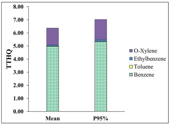 The total target hazard quotient (TTHQ) is equal to the sum of individual THQ [60,61,62,63,64,65,66]. The TTHQ of BTEX was calculated by Equation (3):