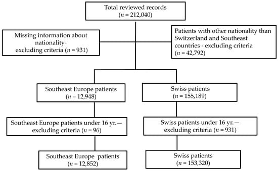 All data were extracted from the routine records of the digital data base system E.care (E.care BVBA, ED 2.1.3.0, Turnhout, Belgium). All patients were grouped according to nationality. Patients were classified into two groups: immigrants from SE without Swiss citizenship and Swiss citizens. Patients with other nationalities were excluded from this study. In these studies, we could not differentiate between native Swiss citizens and naturalized foreigners.