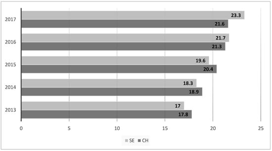 An increase in the annual number of patients was recorded in both analyzed groups over the study period: Swiss n = 33,074 and SE n = 3021 in 2017 compared to 27,218 (Swiss) and 2208 (SE) in 2013 (Figure 2). The largest group of SE patients were from Turkey (n = 2870, 22.3%), followed by Macedonia (n = 2078, 16.2%), and Kosovo (n = 2233, 15.8%) (Table 2).