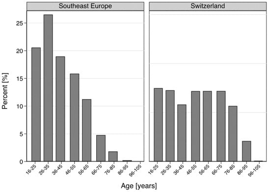 More than half of the Swiss patients were men (55.6%) and 44.4% were women. Similarly, 53.9% of the SE patients were men and 46.1% women. For most SE countries, most patients were male (max. Moldava: 70.0%). However, patients from some countries included many women (Bulgaria: 59.4%, Hungary 57.0%) (Table 2). There were highly significant differences (p < 0.0001) from the Swiss population in patients from Albania, Bosnia and Herzegovina, and Turkey and significant differences (p < 0.05) in patients from Bulgaria, Greece, Hungary, and Serbia.