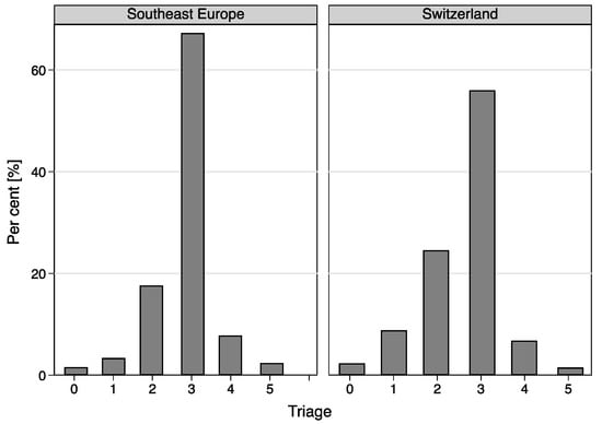 The SE immigrant group exhibited different levels of triage, with a higher proportion in the lower triage level 3 (level 3: 67.3% vs. 56.0% in the Swiss group). Correspondingly, there were more patients in the high triage level in the Swiss group (level 1: Swiss: 8.8%, SE: 3.4%; level 2: Swiss 24.6%, SE: 17.6%) (Figure 4). There was a significant association between the triage level and immigration from SE (p < 0.0001). The mean triage level in patients from SE was 2.84 (95% CI: 2.82–2.85), but from Switzerland 2.61 (95% CI: 2.60–2.61) (p < 0.001).