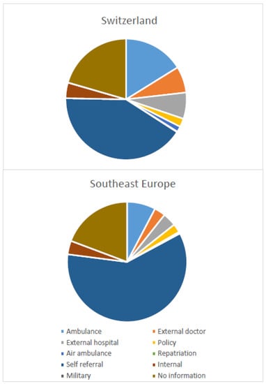 The main difference in the type of referral was observed in the self-referral group, which was more frequent with the SE immigrants (59.9%) than in the Swiss patient population (41.2%) (Figure 5). In contrast, referral by ambulance was more frequent in the Swiss patients than in the SE group (16.2% vs. 7.7%). SE patients of working age (16–65 years) were six times more often admitted by ambulance than were old (≥66) SE patients (86.8% vs. 13.2%), whereas in the Swiss population this ratio was similar. Swiss patients were transferred twice more often from an external hospital or an external doctor than SE patients (external hospital, Swiss 7.0% vs. SE 3.6%; external doctor Swiss 7.0% vs. SE 3.0%).