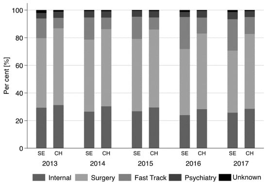 A highly significant association was found between ‘reason for admission’ and immigration from SE (p < 0.001). About 55.0% of Swiss patients (55.3%, n = 84,717) presented with internal medical complaints, 29.5% (n = 45,284) with surgical complaints, and 4.5% with psychiatric complaints. Almost 10.0% of Swiss patients (9.9%, n = 15,127) used a medical service in the fast track section of ED. These values differed significantly in the SE immigrant group: medical: 48.2% (n = 6326), surgery: 26.4% (n = 3388), psychiatry: 4.4% (n = 559), and fast track: 18.9% (n = 2423) (Figure 6).