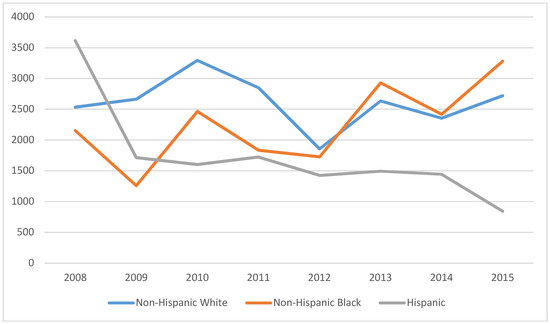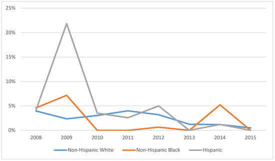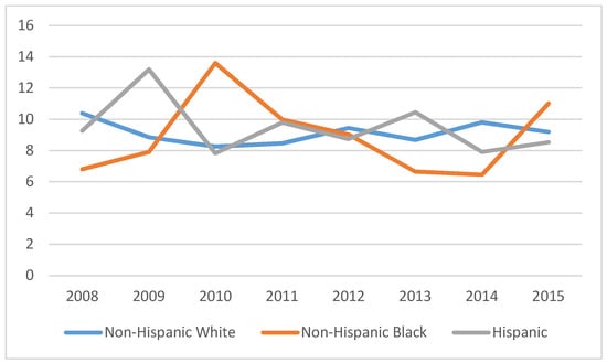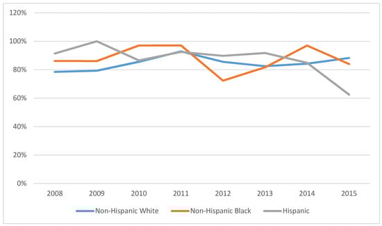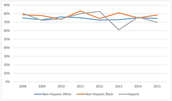 Figure 3. Percent of women age 21–65 having mammogram procedures in the last two years, by race/ethnicity—MEPS 2008–2015 (N = 9613).
