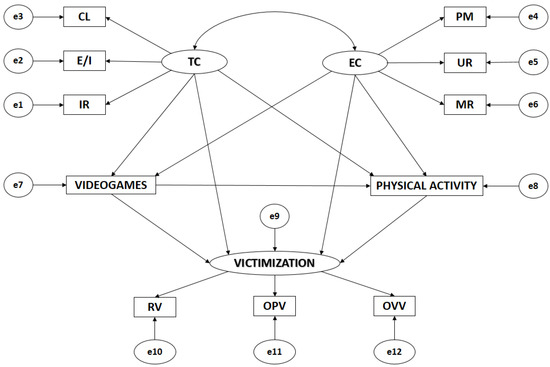 Motivational climate oriented towards task (TC) and motivational climate oriented towards ego (EC) act as exogenous variables, and each of them is inferred by three indicators. For task climate, the indicators are IR (Important Role), E/I (Effort/Improvement), and CL (Cooperative Learning). For ego climate, they are PM (Punishment for Mistakes), UR (Unequal Recognition), and MR (Team Member Rivalry). The use of video games (VIDEO GAMES) acts as an endogenous variable, receiving the effect of task climate (TC) and ego climate (EC). The practice of physical activity (PHYSICAL ACTIVITY) also acts as an endogenous variable, receiving the effect of task climate (TC), ego climate (EC), and the use of video games (VIDEO GAMES). Likewise, victimization (VICTIMIZATION) acts as an endogenous variable, receiving the effect of the use of video games (VIDEO GAMES), the practice of physical activity (PHYSICAL ACTIVITY), task climate (TC), and ego climate (EC).