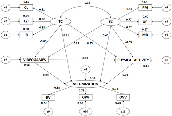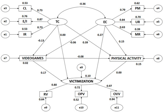As for victimization, the influence of the indicators follows the same pattern in both boys and girls. For girls, however, correlation is slightly stronger in overt verbal victimization, while overt physical victimization and relational victimization have a stronger correlation for boys. The results indicate that girls suffer more verbal victimization than boys, while boys suffer more physical and relational victimization than girls [54,55]. In line with the findings of Devries et al. [56], it is clear that boys are more likely to victimize or be victimized physically, whereas in girls there tends to be a greater bias towards verbal aggression and victimization. The reason for this may be that boys are less fearful of physical aggression, as a result of social and cultural factors [57].