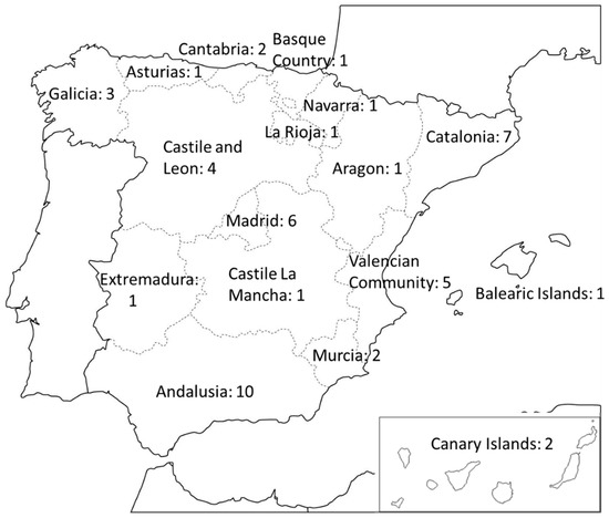 The Spanish university system is made up of private and public universities, distributed throughout the country (Figure 1). There are 52 public universities and 32 private universities. Public universities are financed directly by the central state (National Distance University; Universidad Nacional a Distancia—UNED), or through the regional governments; and private universities are financed by private funds, student fees, and some public funds.