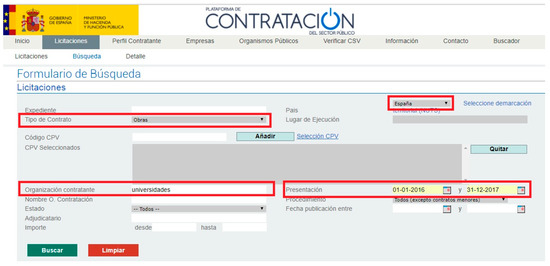 The tenders were collected from a Spanish government tender database (Plataforma de Contratación del Sector Público, in Spanish) (Figure 2) and completed from the university websites. The criteria for downloading the tenders were: Public authorities (universities); type of contract (works); and deadline for the tender (between the 1 January 2016 and 31 December 2017). Works tenders include, as defined by the European and Spanish legislation, the construction, maintenance, and renovation of buildings, roads, airports, in all public facilities. The dates were chosen to include the data for two full post-economic crisis years. The data collection process began in December 2017 and finished in March 2018.