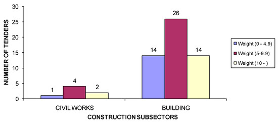 If a comparison is made between the weighting of the environmental criteria and the subsector (Figure 3), then the most used weighting range for environmental criteria was between 5 and 9.9 points over 100 (in both civil engineering and building subsectors).