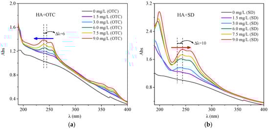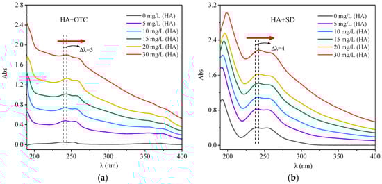 After fixing the concentration of OTC solution and adding different concentrations of HA solution, the UV visible spectrogram of the system is shown in Figure 2. In Figure 2a, the absorbance of the HA-OTC system increased evenly with the increase of the absorption wavelength, and there was a stronger absorption peak in the 230–260 nm range, and also a weaker peak in the 330–360 nm range. With the increase of HA concentration, the absorbance increased gradually and the peak position was weakly red shifted. This may be due to the increase of the mutual agglomeration of HA molecules with the increase of concentration, thus changing the spectral characteristics. The red position shift may be due to the steric hindrance in the molecular system, resulting in an increase of the degree of conjugation [].