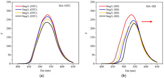 In order to verify the interaction between HA and antibiotics, different concentrations of OTC and SD were added to the HA solution, and the fluorescence spectra of the system were determined, as shown in Figure 3.