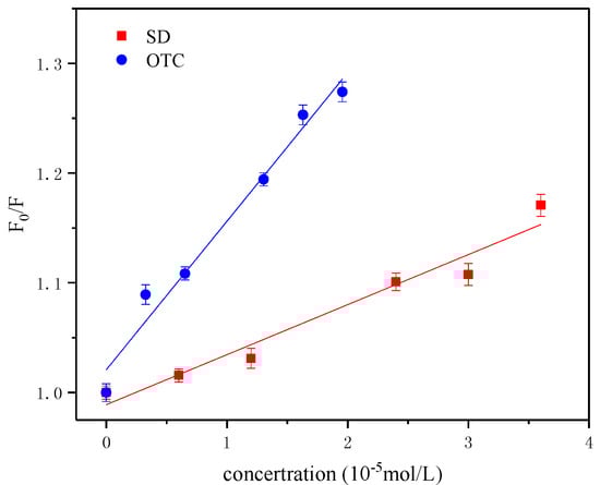 It can be seen from Figure 3a that the addition of OTC had no significant effect on the three-dimensional fluorescence peak shape and peak position of the HA-OTC system compared with HA. However, as the concentration of OTC increased, the intensity of the fluorescence emission spectrum decreased regularly. This indicated that the addition of OTC caused HA fluorescence quenching. Interactions had taken place between them, and the polarity around the HA fluorophore had also changed []. It can be seen from Figure 3b that after adding SD, the peak shape of the HA-SD system was basically unchanged. However, as the concentration of SD increased, the intensity of the fluorescence emission spectrum decreased, and the peak position shifted significantly, indicating a strong interaction between SD and HA. The fluorescence signal and concentration can be fitted by the Stern-Volmer model []: