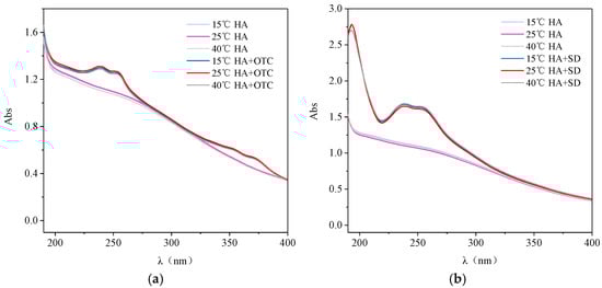 The temperature effects on the UV Vis spectra of HA-OTC and HA-SD systems are shown in Figure 5. Compared with the single HA system, the absorbance of the HA-OTC system was enhanced and the absorption peaks appeared in the range of 230–260 nm and 330–360 nm (Figure 5a), which may be due to the interaction of OTC and HA forming a new ground state complex, which affected the UV visible spectrum of the system. However, with the increase of temperature, both the HA-OTC system and the single HA system showed no changes in the absorbance intensity and peak position, indicating that the temperature had little effect on the HA and HA-OTC systems.
