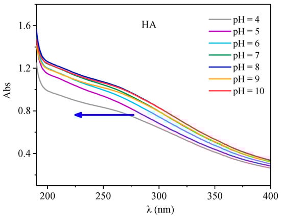 The UV visible spectra of HA molecules under different pH conditions are shown in Figure 6. As a whole, with the increase of absorption wavelength, the absorption intensity decreases rapidly and had no obvious absorption peak, but there was a more obvious absorption platform within the 230–280 nm range, which may be the aromaticity step. Similar phenomena were also found by Guo []. In addition, with the increase of pH, the absorption strength of HA gradually increased, and a weak blue shift occurred, which was similar to the results of Yang []. This may be related to the changes of the acid groups in organic structures and their molecular configurations with the change of pH. According to the changes of UV spectra under different pH conditions, it is known that HA has aromatic structural groups, which can interact with antibiotics, and pH has a certain influence on its structure, so it may affect the interactions between HA and antibiotics.