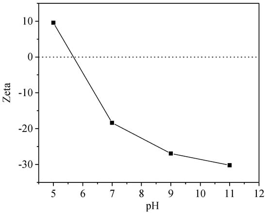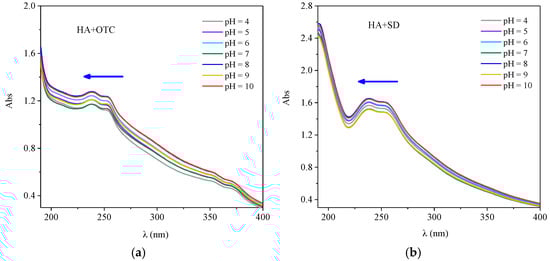 The UV Vis spectra of HA-OTC and HA-SD systems with different pH values are shown in Figure 7. As obtained from Figure 7a, the spectral peak type of HA-OTC at different pHs was basically unchanged, and there was a distinct and weaker acromion in the range of 230–260 nm and 350–370 nm. With the increase of pH, an obvious color enhancement effect and a slight blue shift of the peak position were seen in the spectrogram. In a further investigation of the interactions of HA and antibiotics in soil and water systems, the variation of the zeta potential at different pH values is shown in Figure 8. As the pH increased, the absolute value of the zeta potential of the HA and antibiotic interaction increased gradually. Mainly because of the increase of pH, the acid functional groups of HA were dissociated continuously, the absolute value of the zeta potential increased, the repulsive force between the HA molecules and the particles increases, the intramolecular and intermolecular hydrogen bonds of the HA colloid were broken, resulting in a decrease in the degree of polymerization of the HA particles [], which leads to an increase of the energy needed for the electron transitions of HA molecules. As the degree of polymerization of HA decreased, the specific surface area increased, thus enhancing the adsorption and binding ability with OTC.
