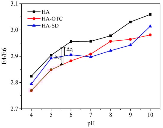The UV visible absorption ratio of specific wavelengths is often used to indicate the structural changes of humus, and the one most widely used is E4/E6 [,,], which can reflect the degree of condensation, aromatization, and molecular complexity of the C skeleton of the humus. It is known from Section 2.3.1 that the change of pH value has great influence on the UV visible spectrum of HA. Therefore, it was necessary to study the influence of different pH on the individual system of HA and the E4/E6 value of HA-OTC and HA-SD systems.