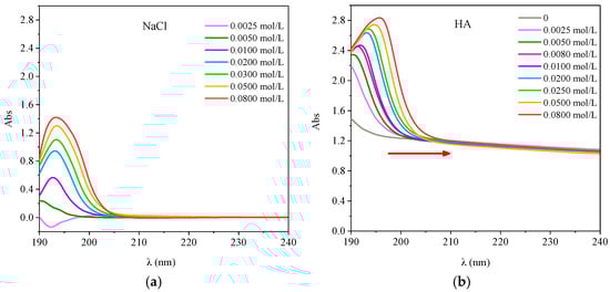The UV Vis spectra of HA with different concentrations of NaCl is shown in Figure 10. The UV-visible spectrum of NaCl showed a characteristic absorption peak at about 193 nm. With the increase of NaCl concentration the absorbency increased gradually (Figure 10a). As shown in Figure 10b, when the ionic strength was 0, the absorption spectrum of HA decreased with increasing wavelength, and no obvious absorption peaks were observed. When ions existed, there was an obvious absorption peak in the range of 190–200 nm.