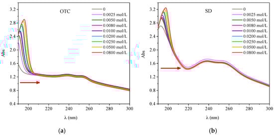 The UV Vis spectra of HA-OTC and HA-SD systems with different ionic strength are shown in Figure 11. According to Figure 11a, when the ionic strength was 0 mol/L, the absorbance of the HA-OTC system decreased slowly with the increase of wavelength, and a weak absorption peak appeared in the 230–260 nm range. With the increase of ionic strength, a clear absorption peak appeared in the 190–200 nm range and the absorbency increased continuously and the peak position was red shifted, which was similar to the study of Lan []. It was possible that the ions produced by the ionizing ions were competing with the complexation of OTC on HA when the ionic strength increased, thus producing a new peak for the multisubstituted phenolics and the π–π* transition of the benzene carboxylic group, the conjugation degree of the system was increased at the same time, and the molecular polymerization was strengthened. Although the groups were not conjugated, their electronic clouds interacted with each other due to their arrangement in space, resulting in the change of the location and intensity of the ultraviolet absorption band []. Therefore, the increase of ionic strength strengthened the polymerization of HA molecules and weakened the interaction with OTC.