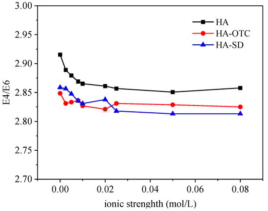 The E4/E6 ratio of HA, HA-OTC and HA-SD under different ionic strengths is shown in Figure 12, where when ionic strength was less than 0.02 mol/L, E4/E6 decreased slowly with the increase of ionic strength, indicating that the degree of skeleton polymerization or the conjugation degree of the carbonyl group increased, which inhibited the interaction between HA and antibiotics. When the ionic strength of the solution was 0.02 mol/L–0.08 mol/L, the E4/E6 ratio basically had no obvious change, which showed that the ion intensity change had little effect on the E4/E6 ratio in this range.