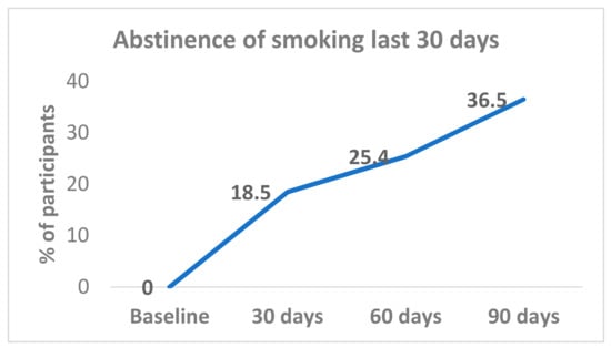 All (100%) participants were smoking at baseline. Complete smoking abstinence was achieved by 18.5% (12/65) at day 30; 25.4% (17/67) at day 60; and 36.5% (23/63) at day 90 (