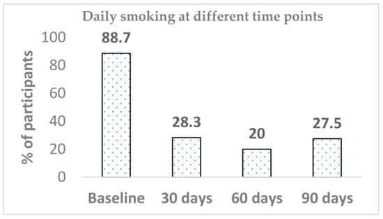 p < 0.001). The declining trend continued until the 60-day mark; then, there was an increase from 20.0% to 27.5%. The difference in daily smoking between day 60 and day 90 was not significant. Similarly, there was no further significant change in daily smoking between any other time points (day 30 versus day 60 or day 30 versus day-90) (