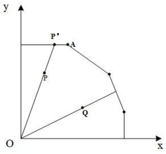 The frontier of the DEA model is composed of piecewise linear functions. The piecewise linear function will appear parallel to the coordinate axis in the space coordinate system, which is the source of the slack problem. In Figure 1, we take a single output and a single input as an example. P’ is the projection of P on the frontier, but P’ is insufficiently produced (i.e., P’A segment) compared to point A on the frontier. If or , there is no input slack variable or output slack variable. In the linear programming of radial DEA, the constraints are expressed in the form of inequalities, rather than equations, which are the basis for the existence of slack variables.