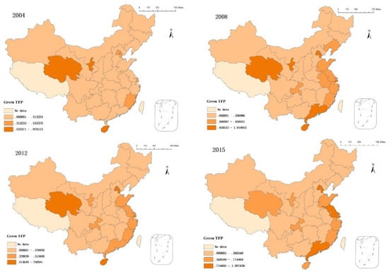 This study used the MaxDEA Pro software to calculate GTFP in 30 Chinese provinces and cities according to the super-efficiency SBM–Global–Luenberger formula. This study divided the nationwide 2004–2015 GTFP into three levels using the ArcGIS natural breakpoint classification method. Regional average value was calculated to analyze temporal and spatial evolution (Figure 2).