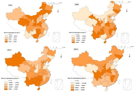 Taking into account that 0 is the demarcation point between capital and labor bias, the index of technological progress classification was improved and divided into four levels using the ArcGIS natural discontinuous point classification method. Specific results are shown in Figure 4.